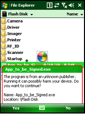 M3 는 디지털 서명을 추가할 수 있는 유틸리티를 제공할 수 있습니다. 서명되지 않은 프로그램을 실행시킬 때에는 아래의 그림처럼 경고 메시지가 보여집니다. .