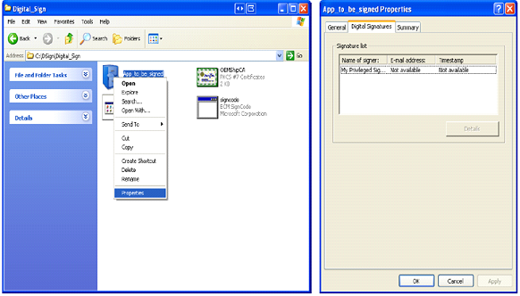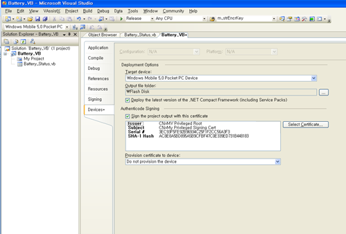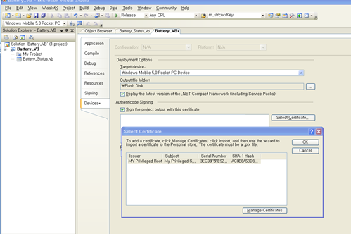 Property →Devices →Check 'Sign the… →Click Select Certificate →Select 'My Privileged …’→‘OK’