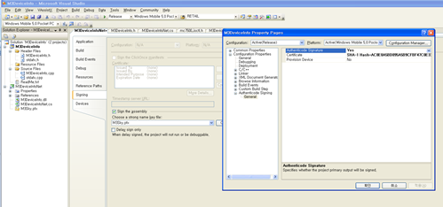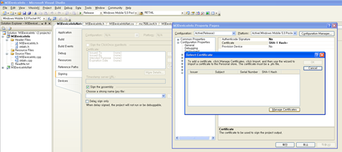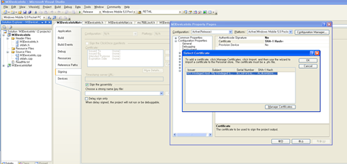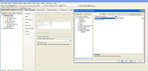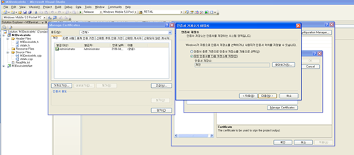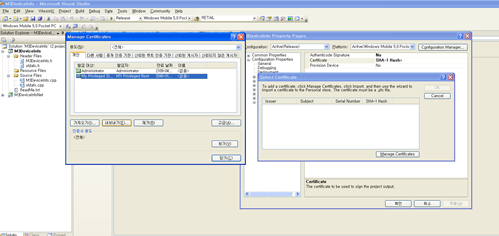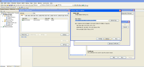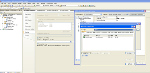 메뉴 탭의 Project를 오른쪽 클릭한 후→ 'Authenticode Signing' →Click Certificate '…