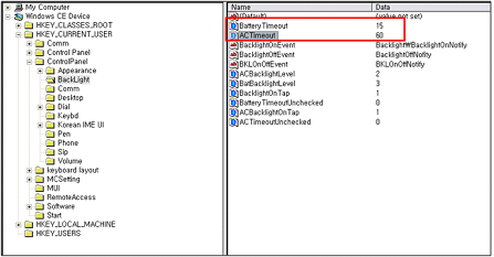 백라이트 레벨과 타임아웃은 레지스트리 값으로 조정될 수 있습니다
