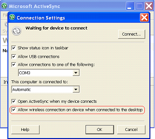 단말기가 PC에 ActiveSync로 연결되어 있다면 WLAN이 자동적으로 종료됩니다. 그 대신 PC에서 사용하고 있는 인터넷에 연결됩니다. ActiveSync 연결후 WLAN이 필요한 경우 다음의 옵션들을 Active Sync Connection 설정에서 적용합니다