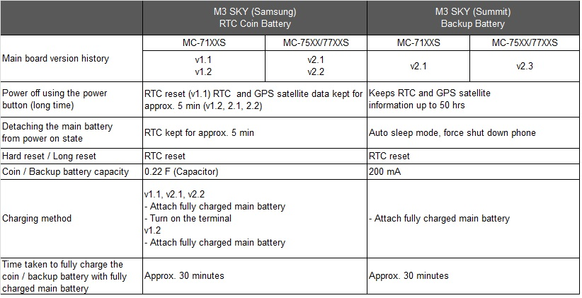 코인베터리는 메인보드 main boards v1.1 (MC-71XXS), v2.1 과 v2.2 (MC-75XX/77XXS) 에서 시스템 전원에 의해 충전되며 이러한 이유로 전원버튼을 10초 가량 눌러 단말기를 종료 시키는 경우 시스템은 멈추며 결과적으로 코인배터리가 동작하지 않게 됩니다. 결국 RTC가 리셋됩니다. 코인배터리를 충전하려면, 메인 배터리가 단말기에 장착되어 있어야 하고 단말기 전원은 켜져 있어야 합니다. 단말기가 켜져 있지 않다면 메인 배터리가 장착되어 있더라도 코인 배터리는 충전되지 않습니다. 또한 단말기가 꺼져 있는 상태로 크래들 충전을 하여도 마찬가지로 코인 배터리는 충전되지 않습니다. RTC 리셋을 방지하기 위해서는 전원 버튼을 10초간 눌러 단말기 전원을 꺼서는 안됩니다. 메인보드v1.2 (MC-71XXS)에서 코인배터리는 메인배터리를 통해 충전이 되고 메인 배터리의 상태를 따라갑니다. 그렇기 때문에 전원버튼을 10초간 눌러 단말기를 종료하게 되도 시간 정보가 리셋되지 않습니다. 하지만 완충된 코인 배터리는 RTC와 GPS데이터를 단 5분간만 유지 시킬 수 있기 때문에 전원 공급 없이 단말기를 5분 이상 방치하게 되면 RTC와 GPS 데이터가 리셋 될 것입니다. 또한 이러한 특성으로 인해 메인배터리가 5분 이상 분리되었을 경우, 저장된 데이터는 리셋 될 것입니다.