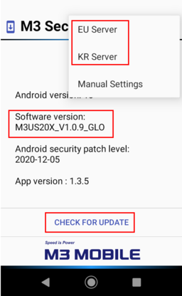 2. 현재 버전 확인, 서버 선택한 후 'CHECK FOR UPDATE' 클릭.